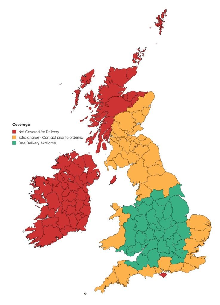 Delivery outside our Green Zones will incur an additional charge payable to the courier service.
